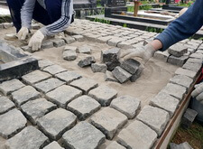 Заранее просыпав площадь места захоронения пескобетонной смесью начинаем строгими рядами укладывать брусчатку.